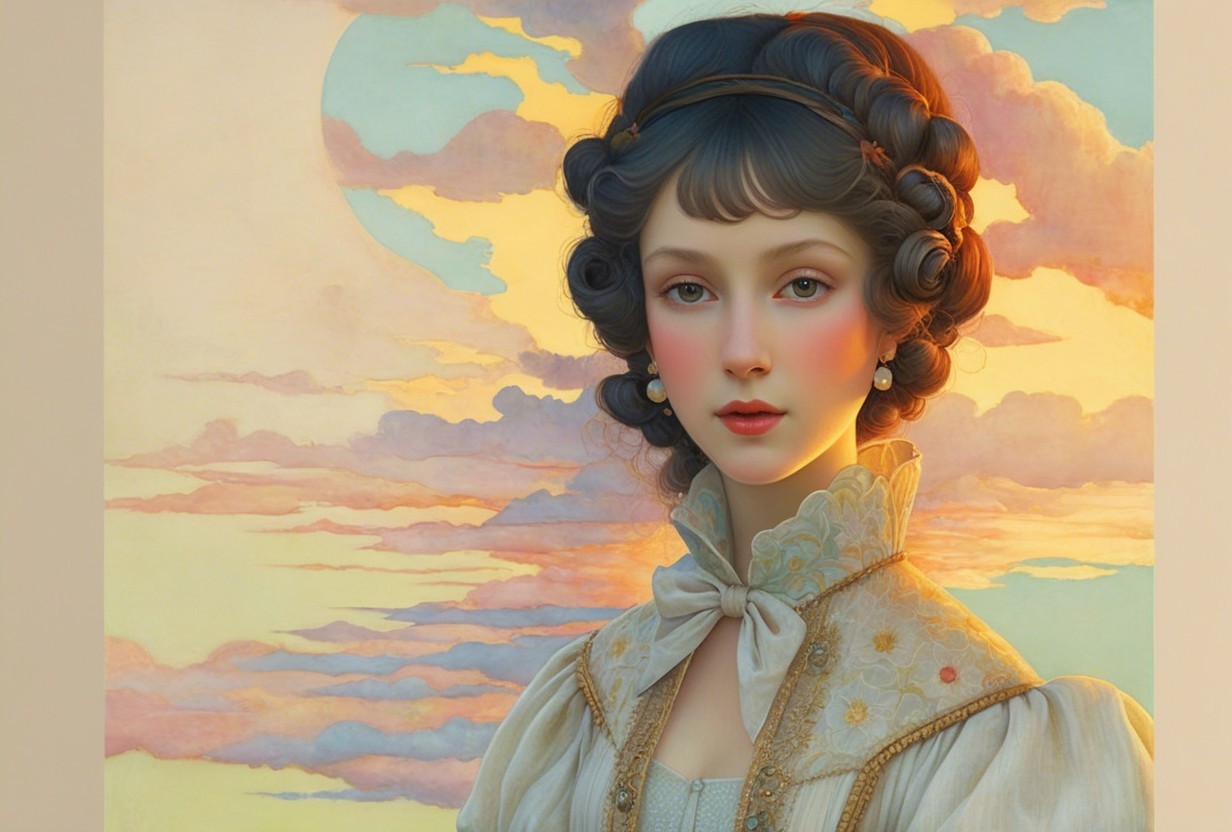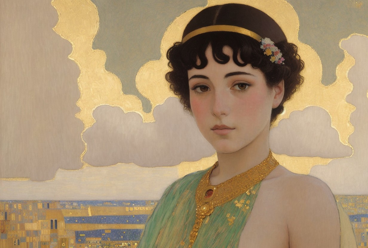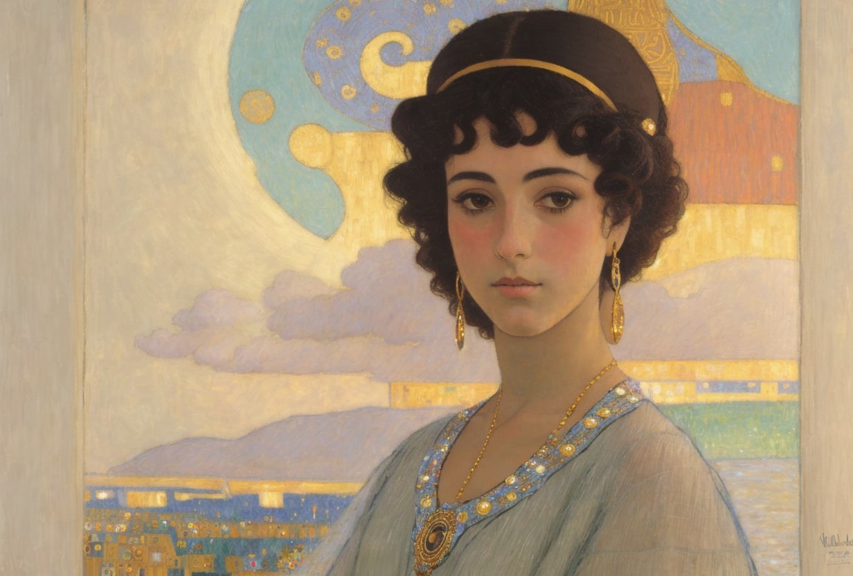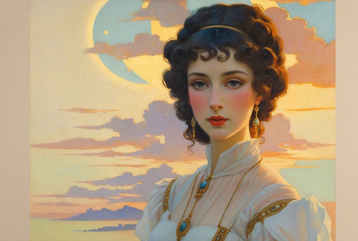 A graceful figure stands before the pyramids, draped in a flowing garment. Golden hues and a celestial backdrop create a mystical atmosphere, blending ancient history with ethereal beauty.