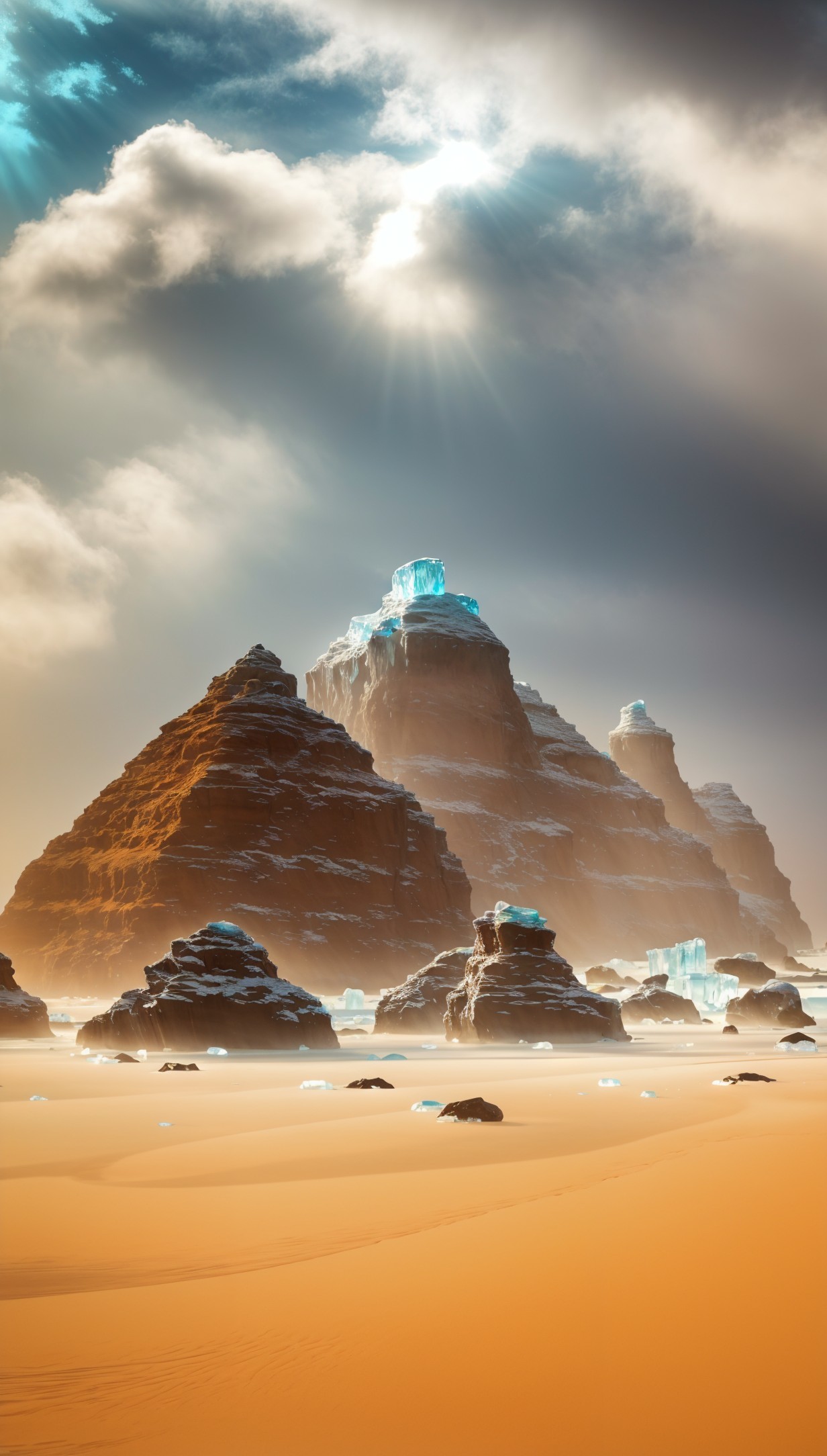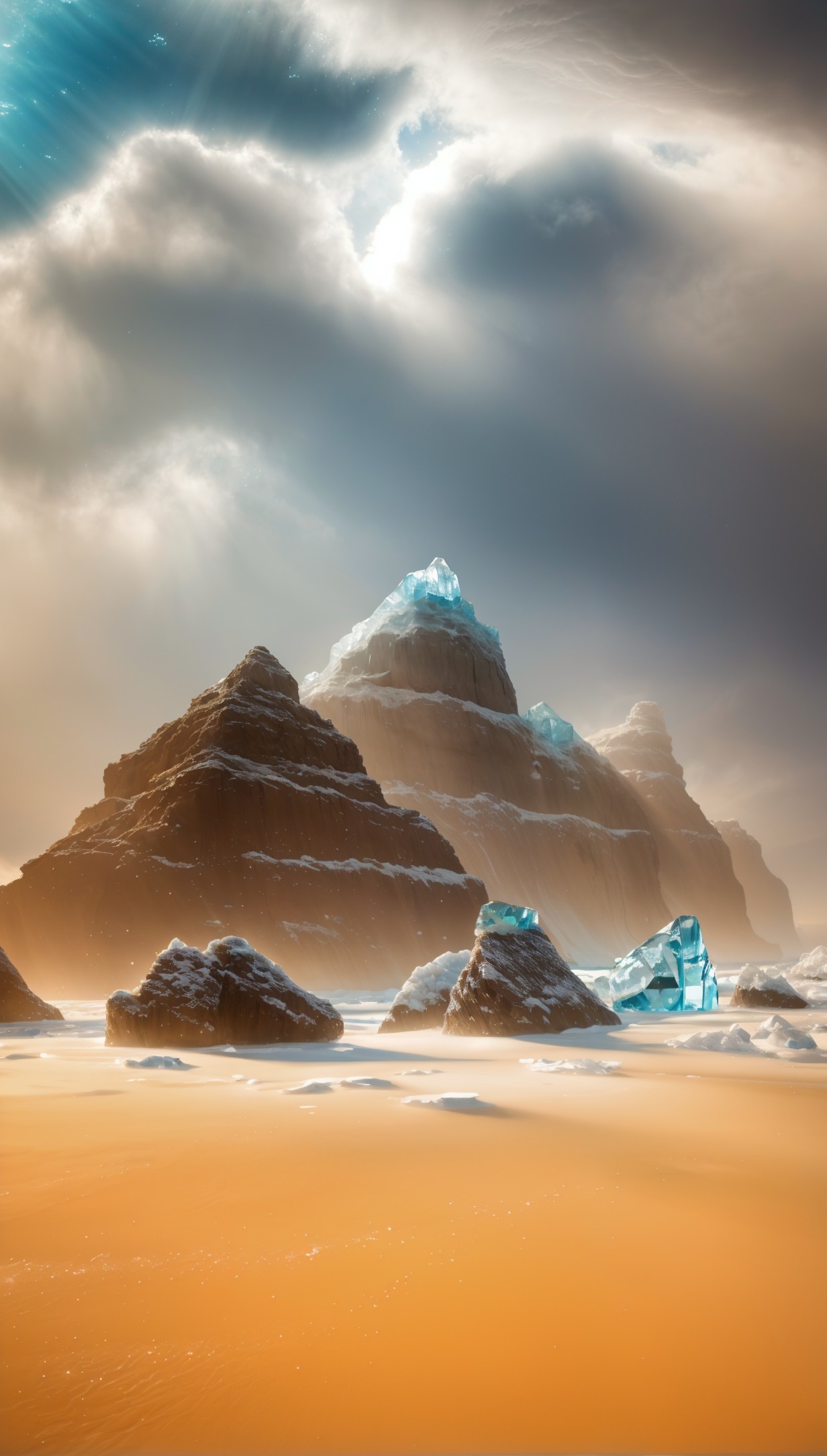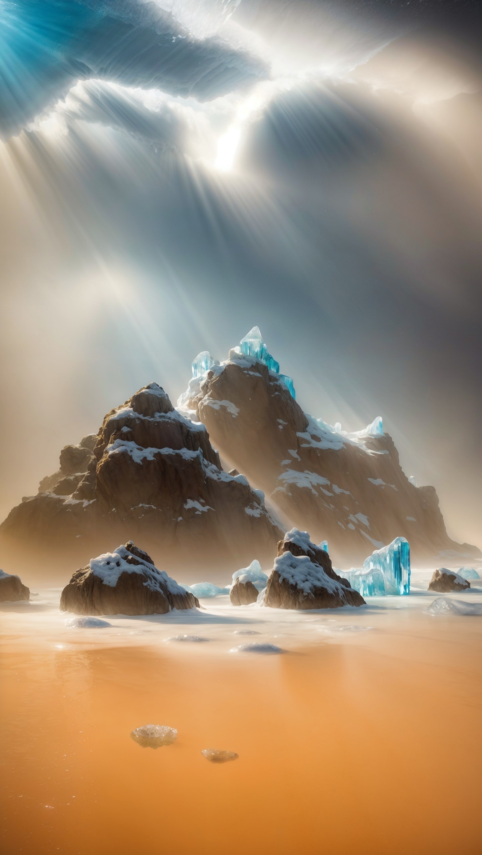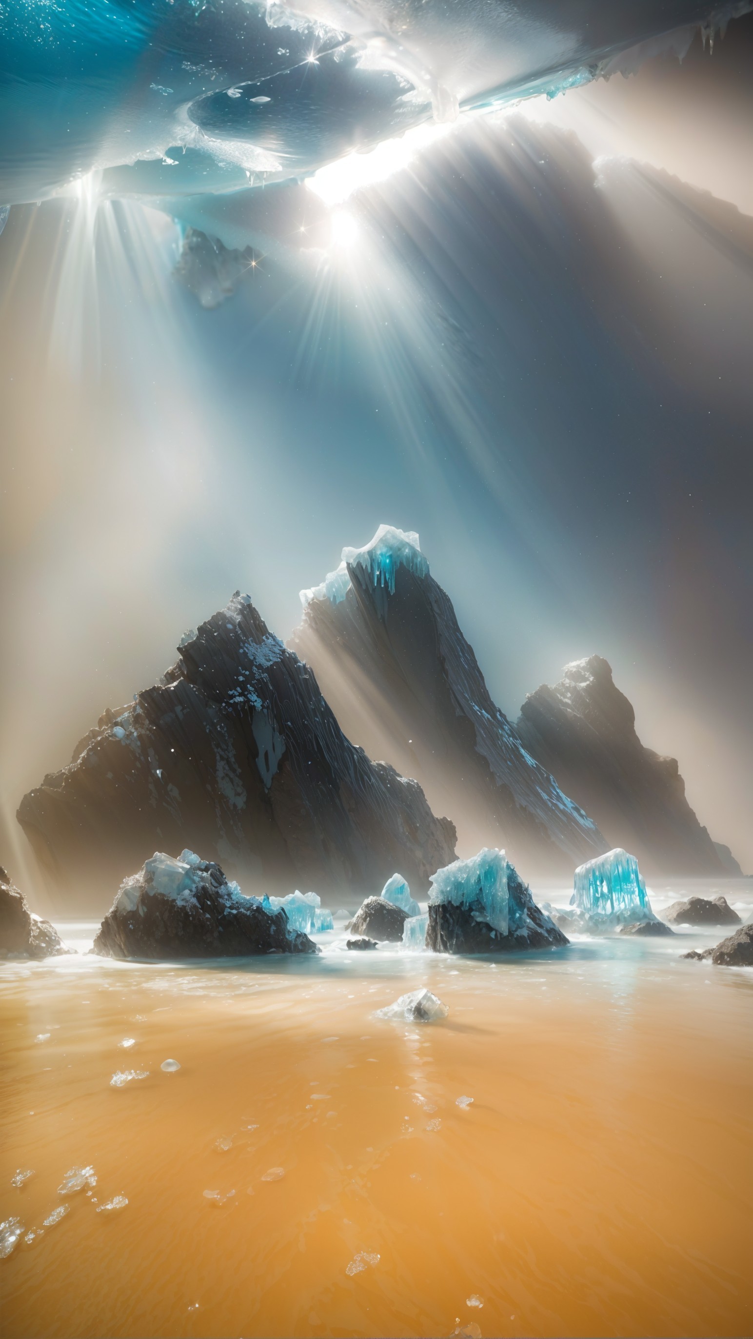 Prompt: Create a stunning underwater scene that captures a serene and mystical ambiance. The setting should be beneath a thick layer of ice, with sharp, jagged icicles hanging from the ceiling, reflecting a vibrant blue light. The water should appear crystal clear, illuminated by beams of sunlight penetrating through the ice above, creating a dreamlike effect with soft shadows dancing on the sandy ocean floor. The sand should be smooth and untouched, subtly shifting in color from light beige to pale blue, blending seamlessly with the water. Include intricate details like bubbles rising towards the surface and a few scattered pebbles on the ocean bed. Aim for a sense of tranquility and wonder, evoking a feeling of exploration in this captivating, icy landscape.