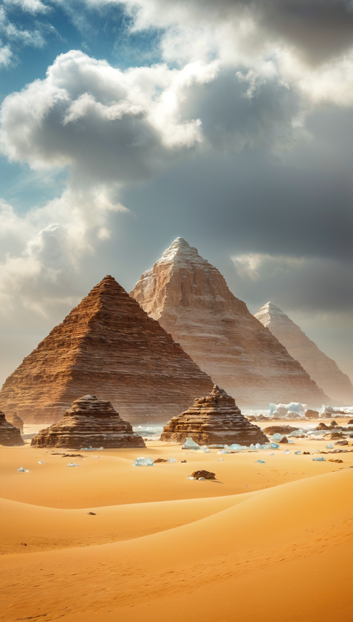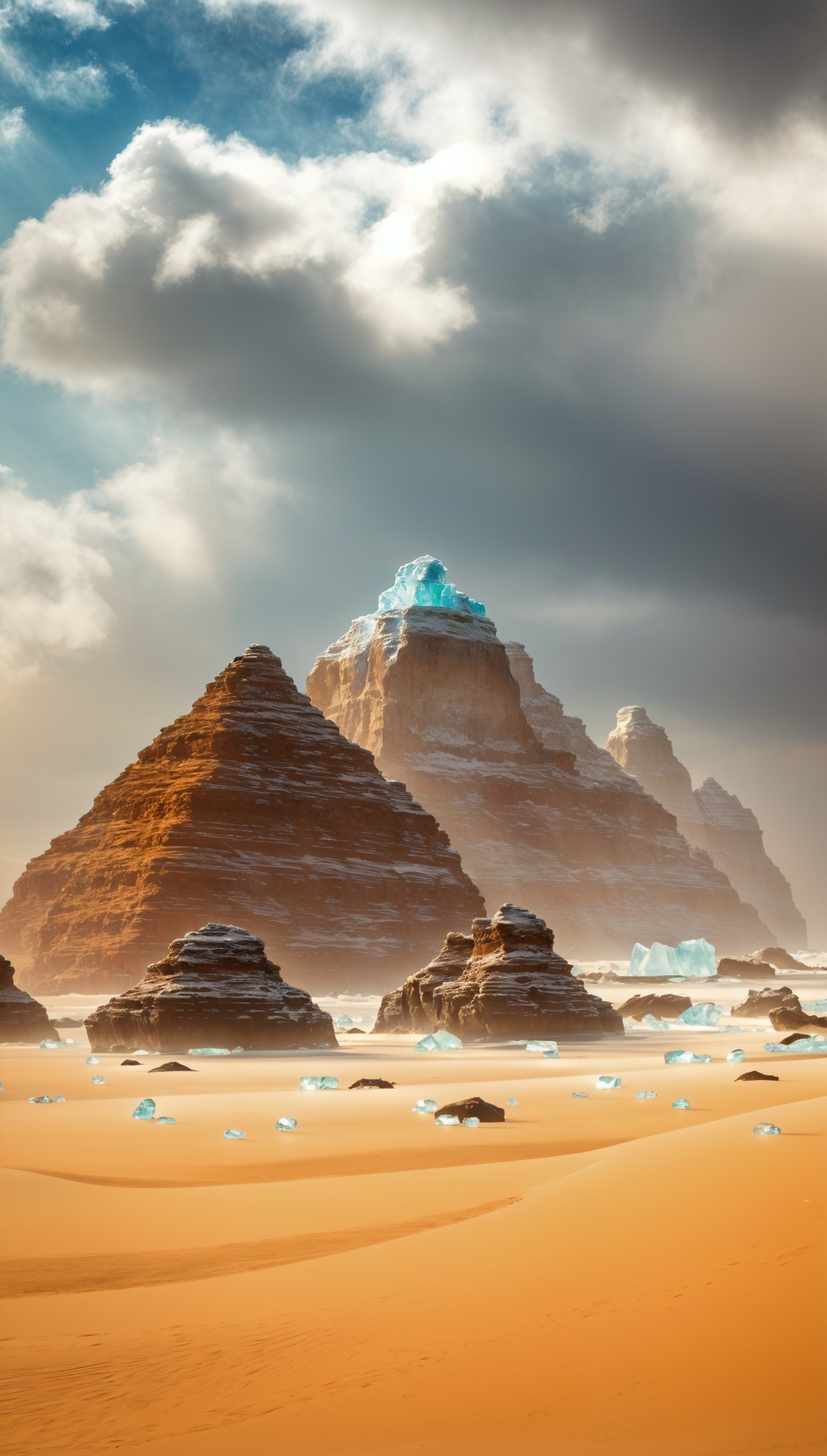 + Prompt:Create a stunning underwater scene that captures a serene and mystical ambiance. The setting should be beneath a thick layer of ice, with sharp, jagged icicles hanging from the ceiling, reflecting a vibrant blue light. The water should appear crystal clear, illuminated by beams of sunlight penetrating through the ice above, creating a dreamlike effect with soft shadows dancing on the sandy ocean floor. The sand should be smooth and untouched, subtly shifting in color from light beige to pale blue, blending seamlessly with the water. Include intricate details like bubbles rising towards the surface and a few scattered pebbles on the ocean bed. Aim for a sense of tranquility and wonder, evoking a feeling of exploration in this captivating, icy landscape.