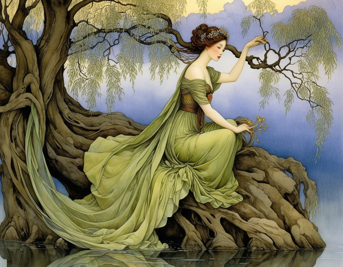 A fantasy scene depicts a woman in a flowing green gown, intertwined with nature, as she sits gracefully by a tranquil water’s edge, surrounded by a large, textured tree and gentle foliage.
