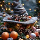 A whimsical winter scene features a cozy, snow-covered hat adorned with ornaments and pinecones, surrounded by glittering golden baubles amidst a serene, snowy backdrop.