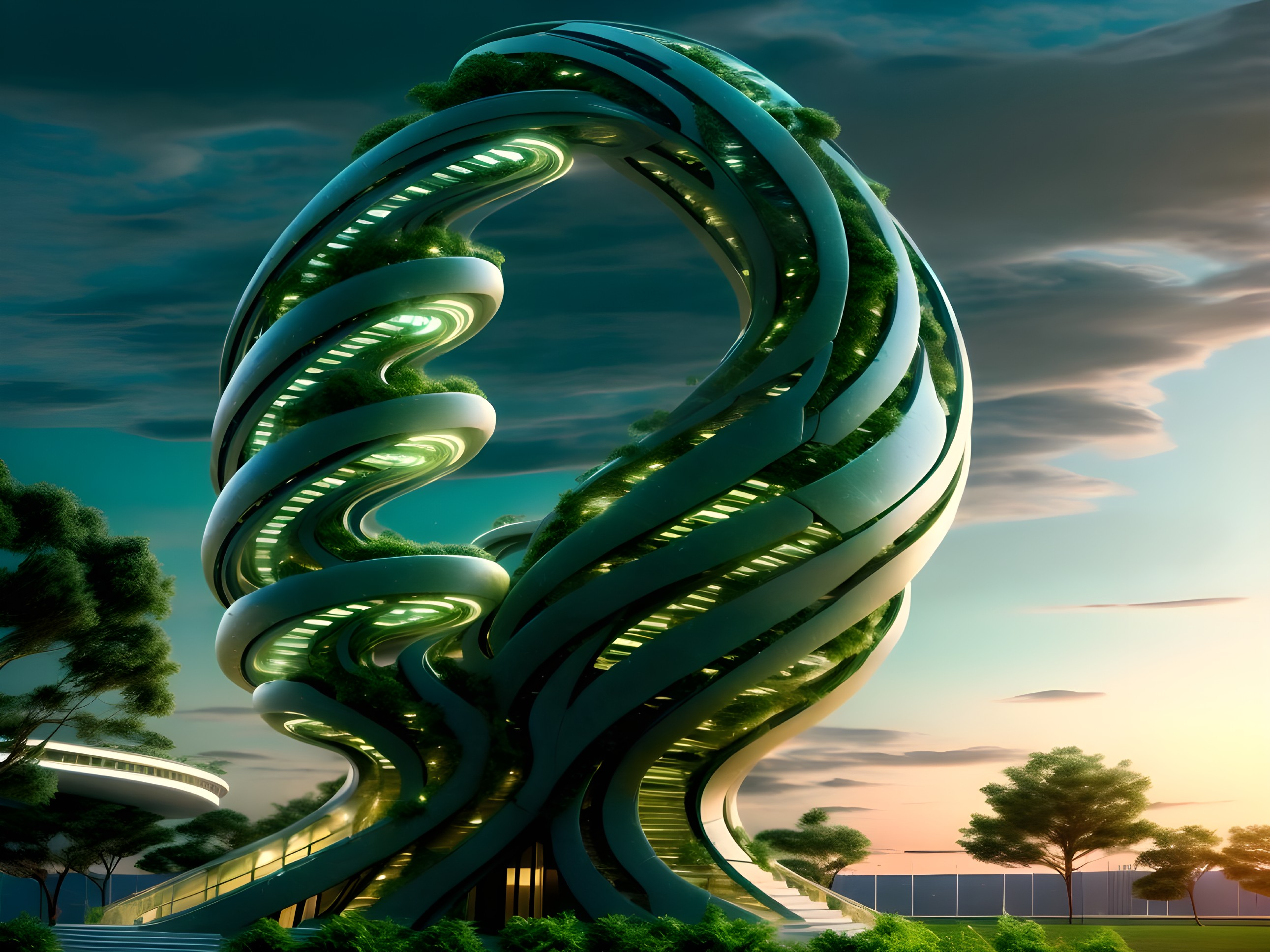 A futuristic, twisting skyscraper features a lush greenery facade, with sleek curves and illuminated sections, set against a dramatic sky at sunset, showcasing innovative architectural design.