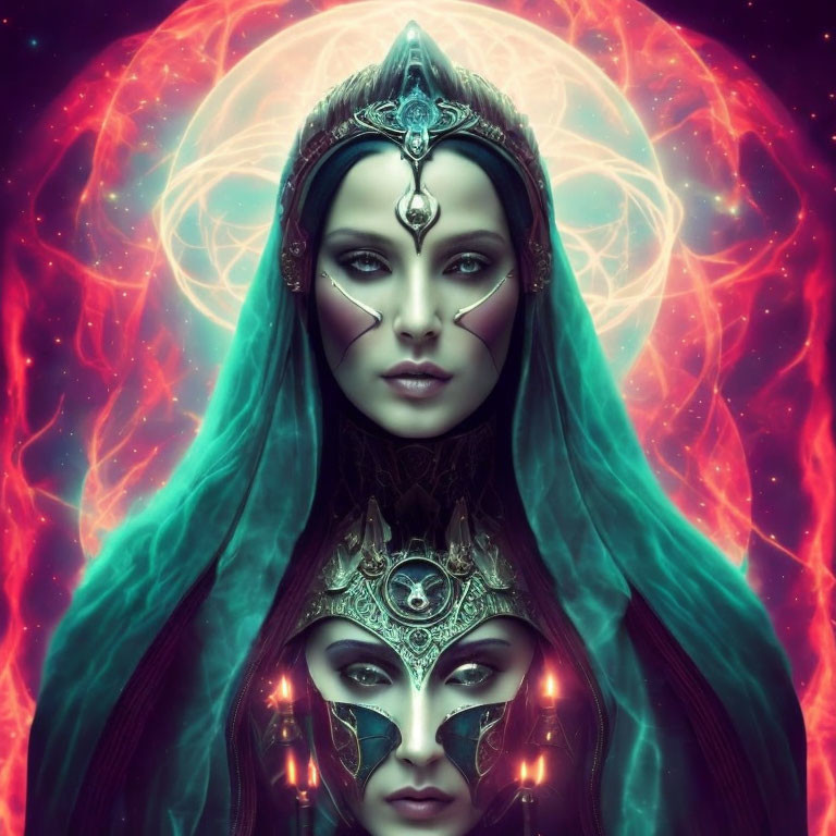 The Goddess Hecate, resin moon, maiden mother crone, triple moon goddess, titaness, witchcraft and sorcery, arcane magic, mystiokinesis, powerful and beautiful, beautiful symmetrical face, anatomically correct, occult theme, ethereal light, glowing, reflected light, enhanced light and shade, goddess of the night, art by Tom Bagshaw, H.G. Giger, Gerald Brom, Naoto Hattori, Gustav Dore, Jean Baptiste Monge, Patchwork style, eerie and ominous, rich colors, flowing wild hair, glowing fire eyes, arcane face tattoos, dark witch with triple moon