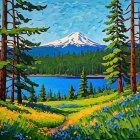 A vibrant, colorful landscape featuring a serene lake surrounded by tall trees, blooming flowers, and majestic mountains under a bright blue sky, capturing the beauty of nature in a geometric style.