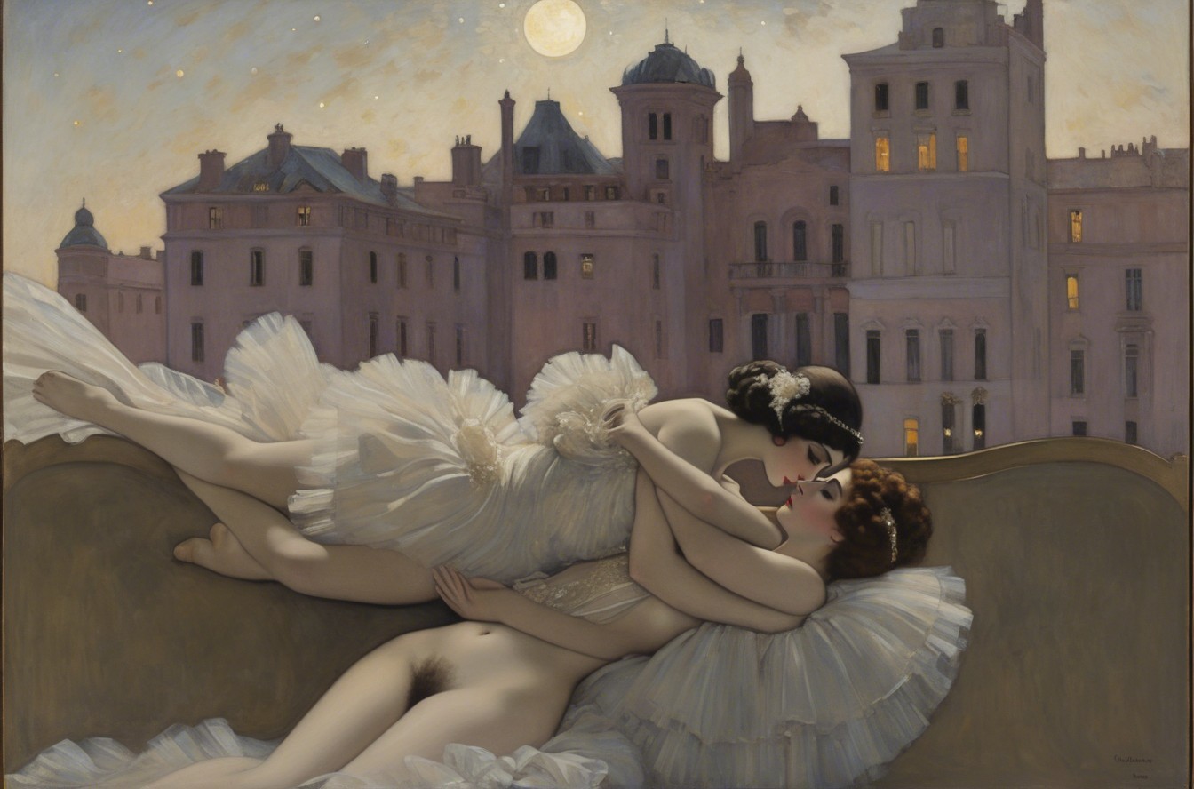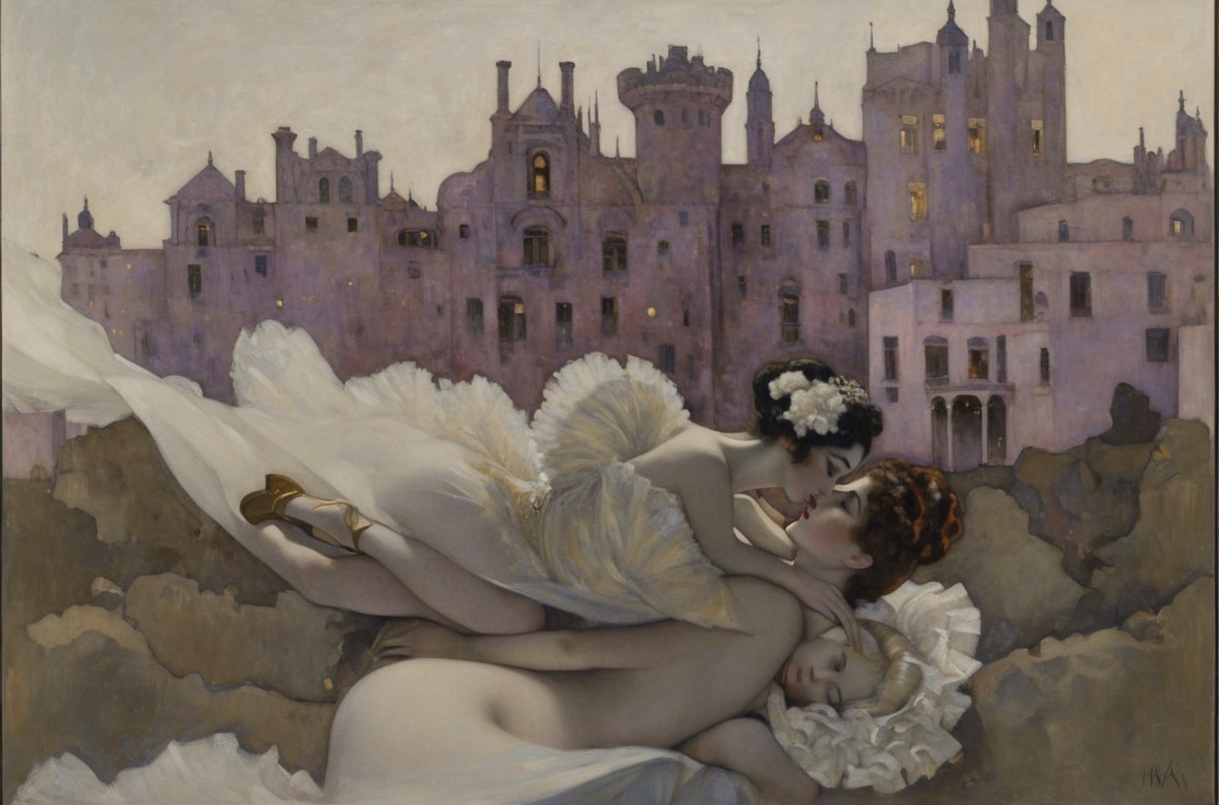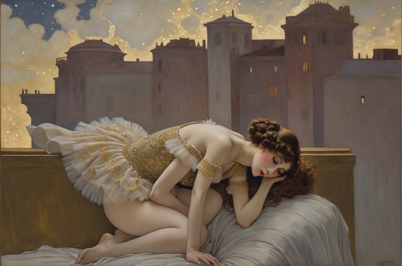 A glamorous woman reclines elegantly on a bed, draped in a flowing golden gown. The opulent room features rich decor, warm lighting, and a night sky visible through large windows.