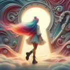 Two girls stand at the entrance of a vibrant, swirling tunnel of rainbow colors and glossy textures, exuding a whimsical, fantasy-like atmosphere under a dreamy sky.
