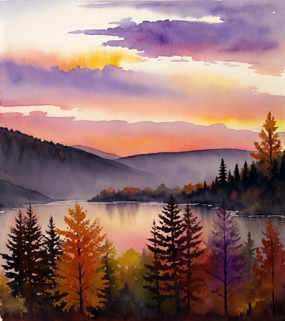 Vivid Watercolor Painting: Serene Lake Sunset with Autumn Foliage