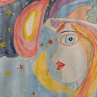 The artwork features a whimsical astronaut with a prominent mustache, surrounded by vibrant, swirling colors and celestial bodies, evoking a sense of wonder and exploration in outer space.