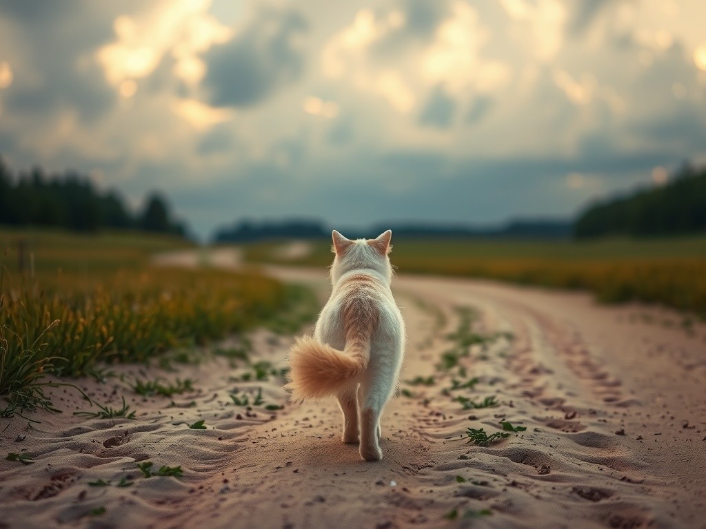 A fluffy white cat walks on sandy terrain with lush grass on the sides under a dramatic, cloudy sky.