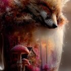 A cozy scene featuring a sleeping fox curled up in a whimsical teacup adorned with vibrant autumn foliage, mushrooms, and a charming miniature house, all amidst a backdrop of fall colors.