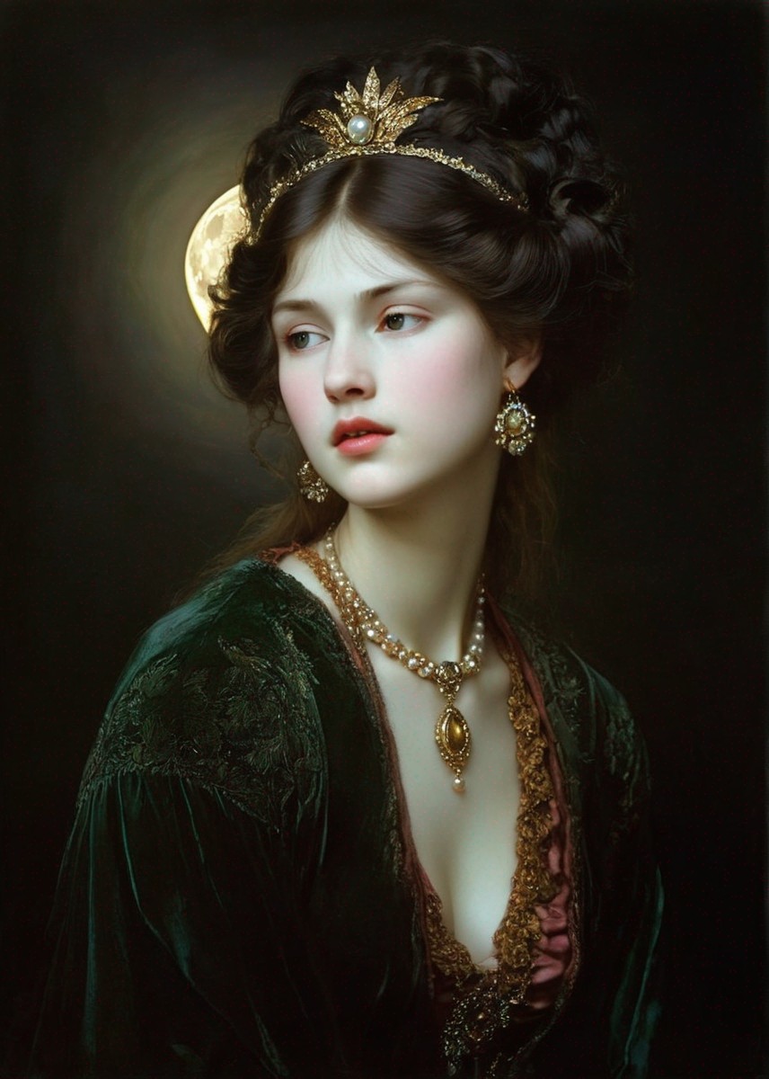 Woman in flowing green dress gazes at luminous full moon by open window