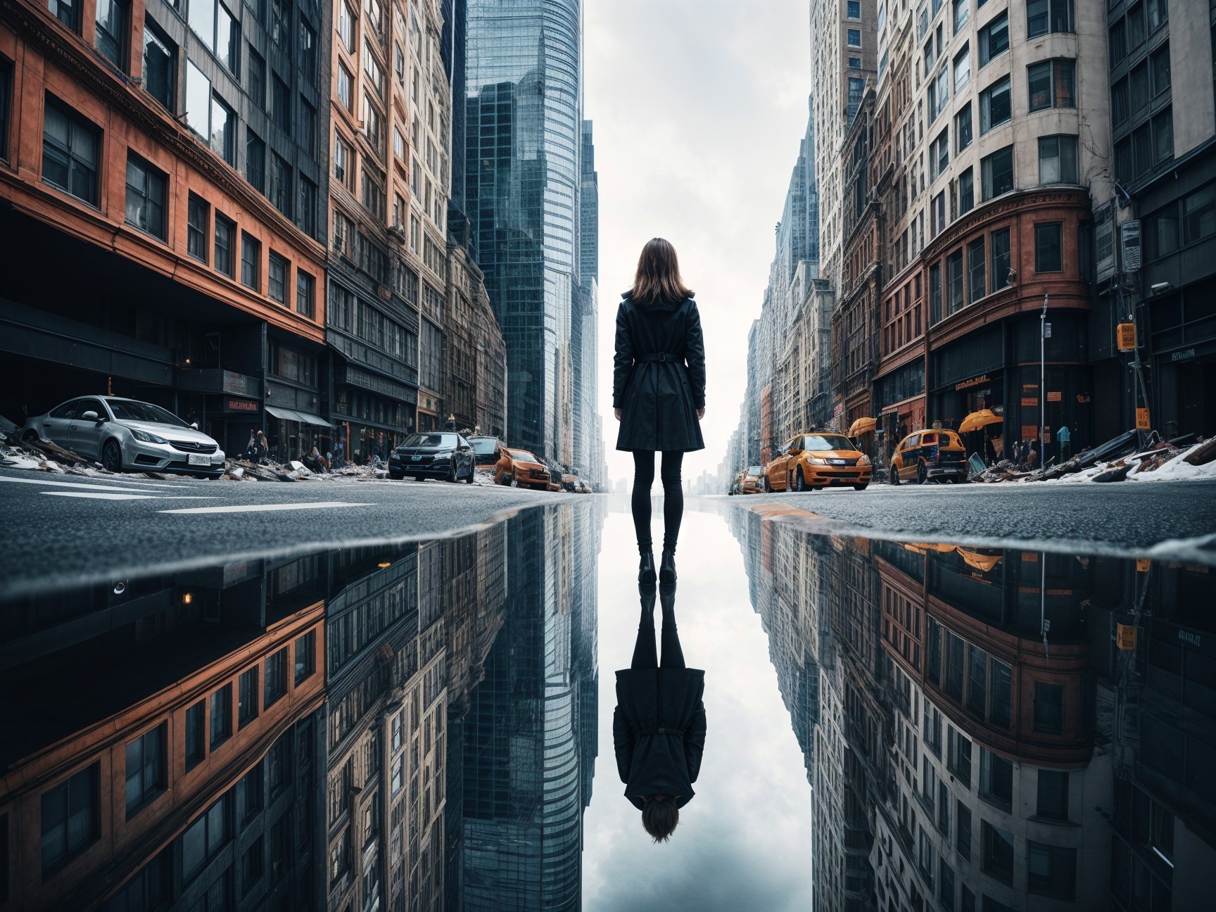 A woman stands in the center of a deserted city street, reflected in a large puddle. Skyscrapers loom above, and yellow taxis line the road, creating a striking urban scene.