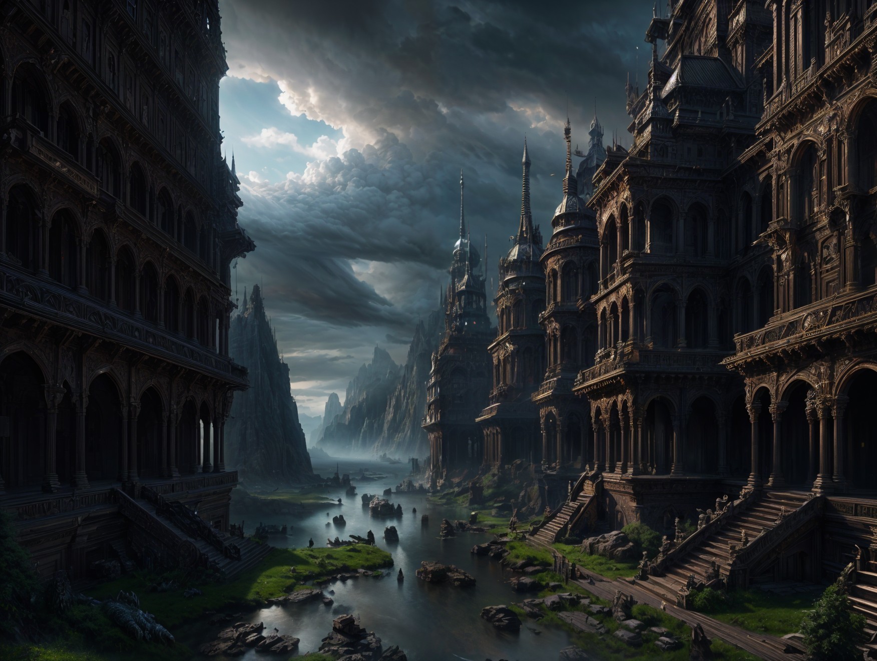 A breathtaking, mystical landscape featuring grand, intricate buildings along a serene river. Towering mountains rise in the background under a dramatic sky, creating an atmosphere of wonder.