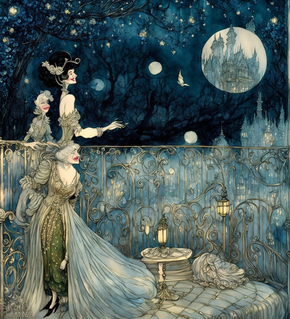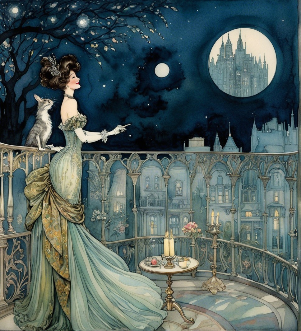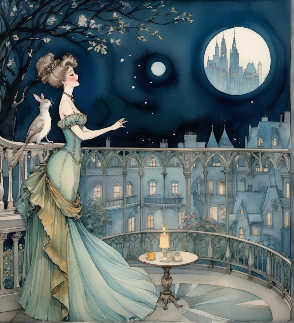 A whimsically elegant woman in a flowing green gown stands on a balcony, gazing at the moonlit skyline, accompanied by a white bird. The scene exudes a dreamy, nostalgic atmosphere.