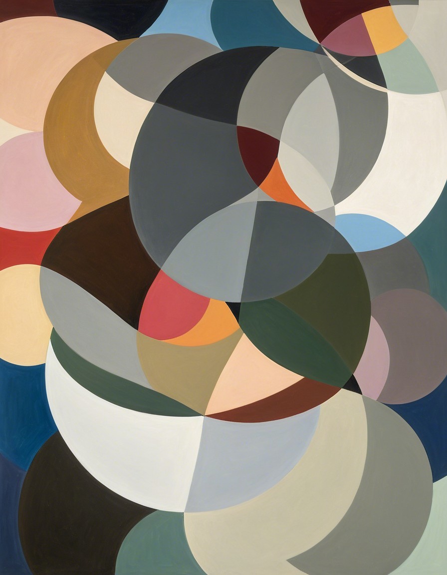 The image features an abstract composition of overlapping geometric shapes in various earthy tones, including muted blues, reds, and creams, creating a harmonious interplay of curves and colors.
