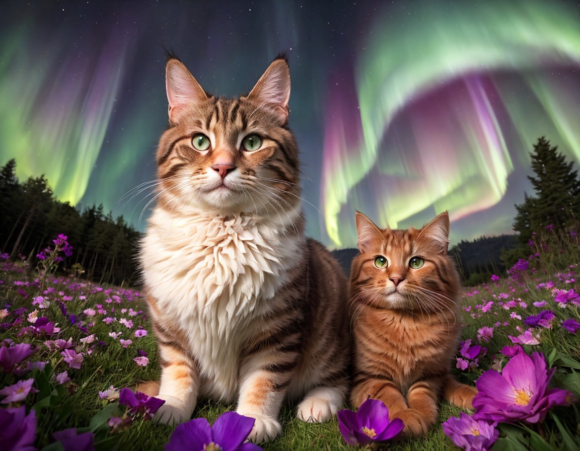 Two majestic cats with vibrant coats sitting amidst purple flowers under a striking aurora borealis in a night sky.