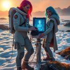 Two astronauts with pink hair examine a futuristic, transparent device in a rocky, snow-covered landscape. High-tech interfaces illuminate their surroundings, blending adventure and technology.