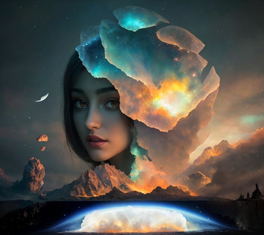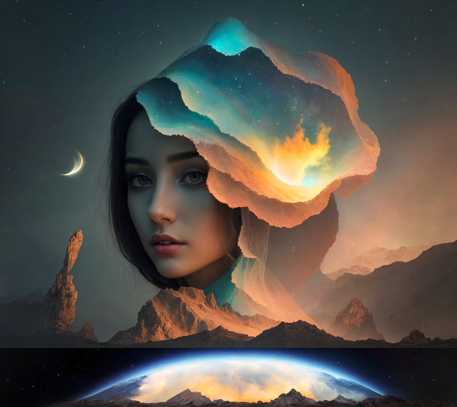 Portrait of woman with cosmic hair near mountains, water, planet, starry sky