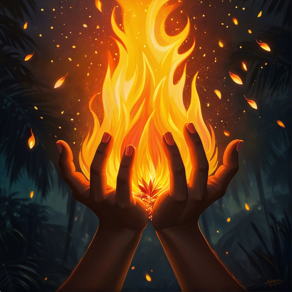 A spark ignites within open palms, blazing into a powerful flame, while fire-kissed fireflies drift outward, casting enchanted glimmers into the darkened night.