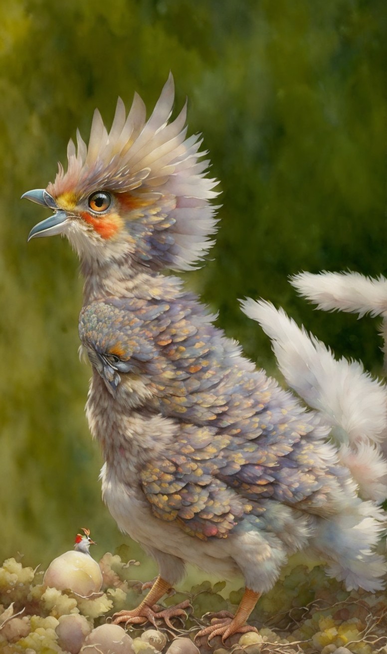 Two vividly colored birds with striking feathers and crest-like plumage stand on a rocky surface, surrounded by a lush, green backdrop, showcasing intricate details and a whimsical charm.