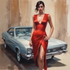 A glamorous woman in a sleek, dark dress poses confidently next to a shiny red vintage car, with a classic black car in the background, exuding a retro and stylish vibe.