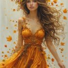 A striking figure stands against a glowing full moon, wearing a vibrant, flowing dress with rich autumn colors. Her voluminous hair features a floral accent, embodying elegance and beauty.
