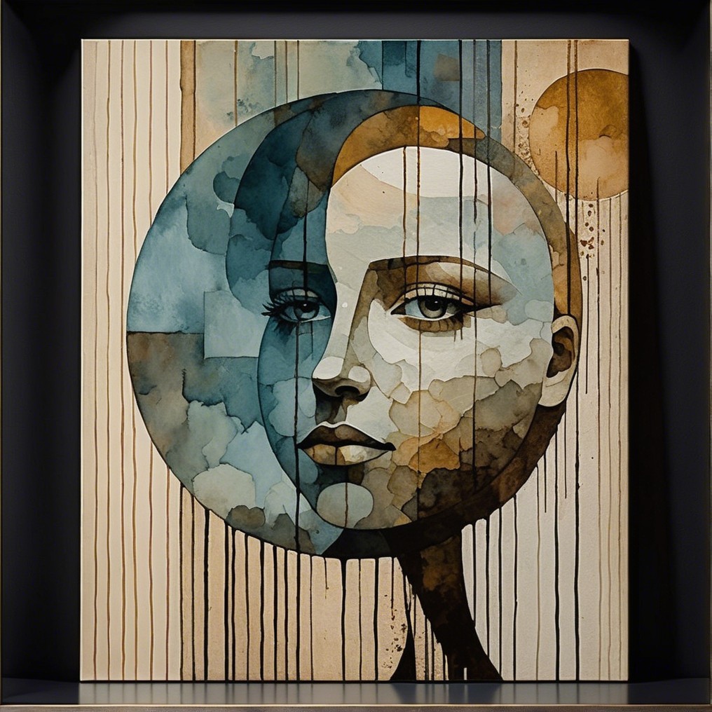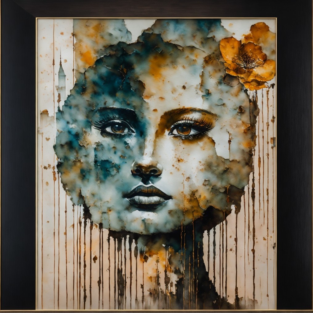 A striking portrait of a woman with abstract geometric patterns on her face, delicate floral accents in her hair, and a blend of soft watercolor hues, creating a captivating and ethereal aura.