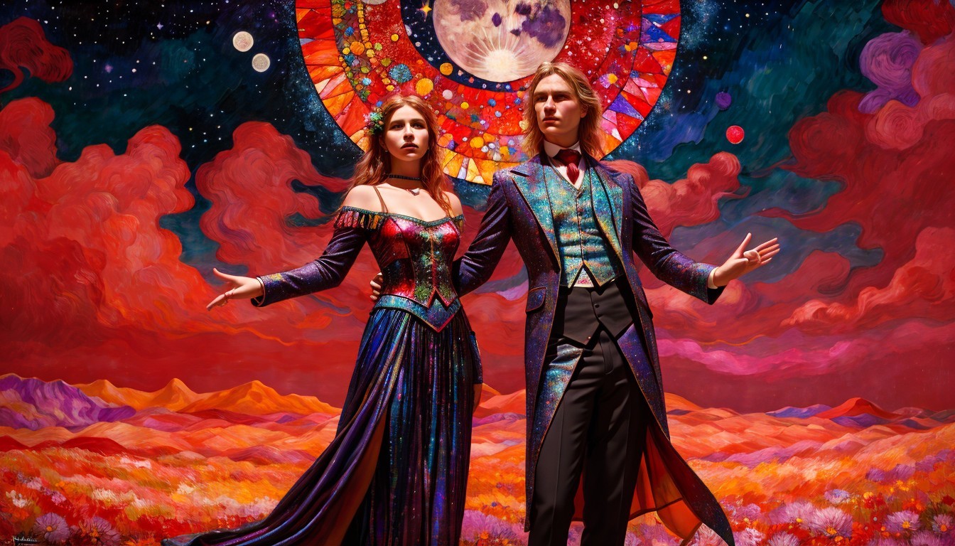 + Prompt:highland red flower spectacular, river, cosmic night sky with a full bright large moon and stars, made of mixed media, acryllc, stained glass and metallic paints