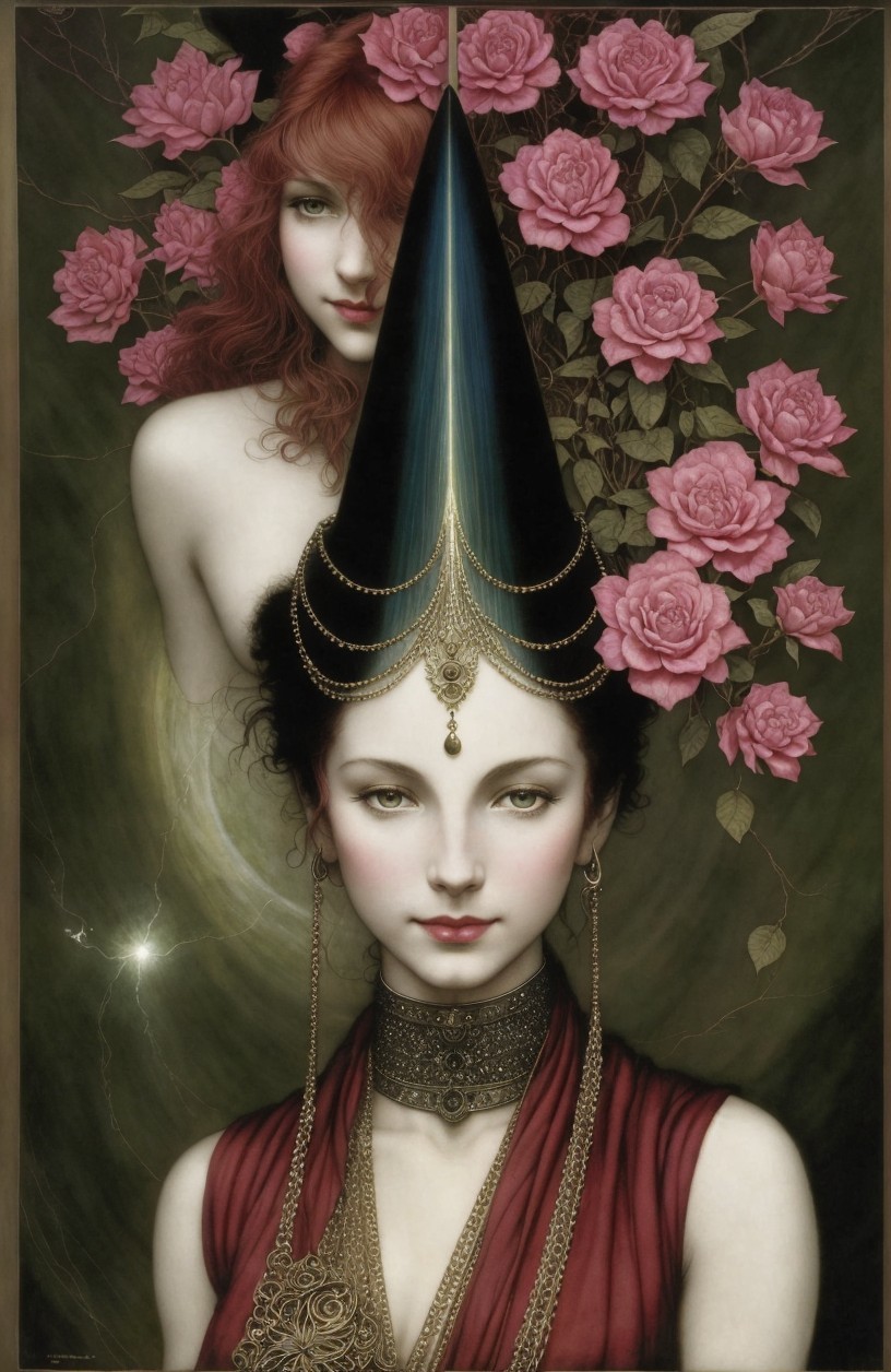 The portrait features a young woman with striking features, adorned in intricate attire. Her dramatic headdress and delicate feathers create an ethereal, regal atmosphere.