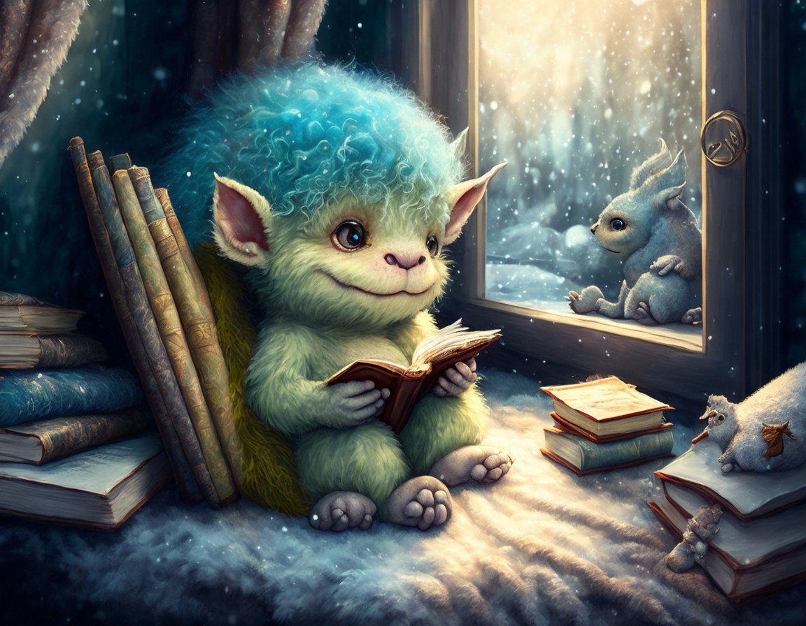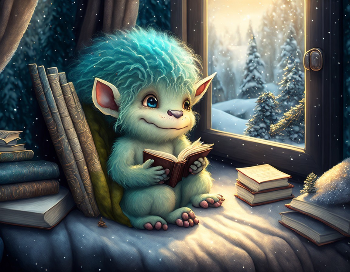 Blue-haired creature reading book by window in winter scene with cat and books.