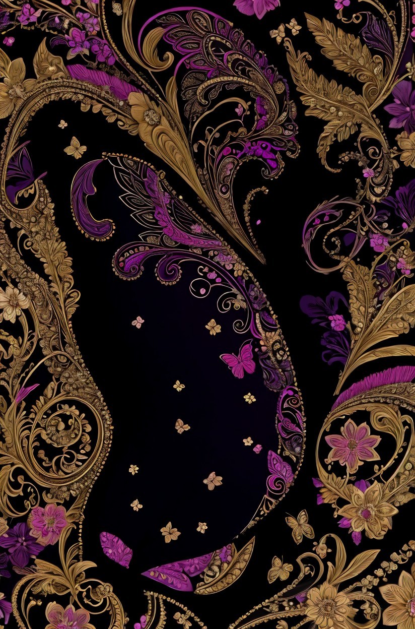 Intricate golden floral and butterfly pattern on black background