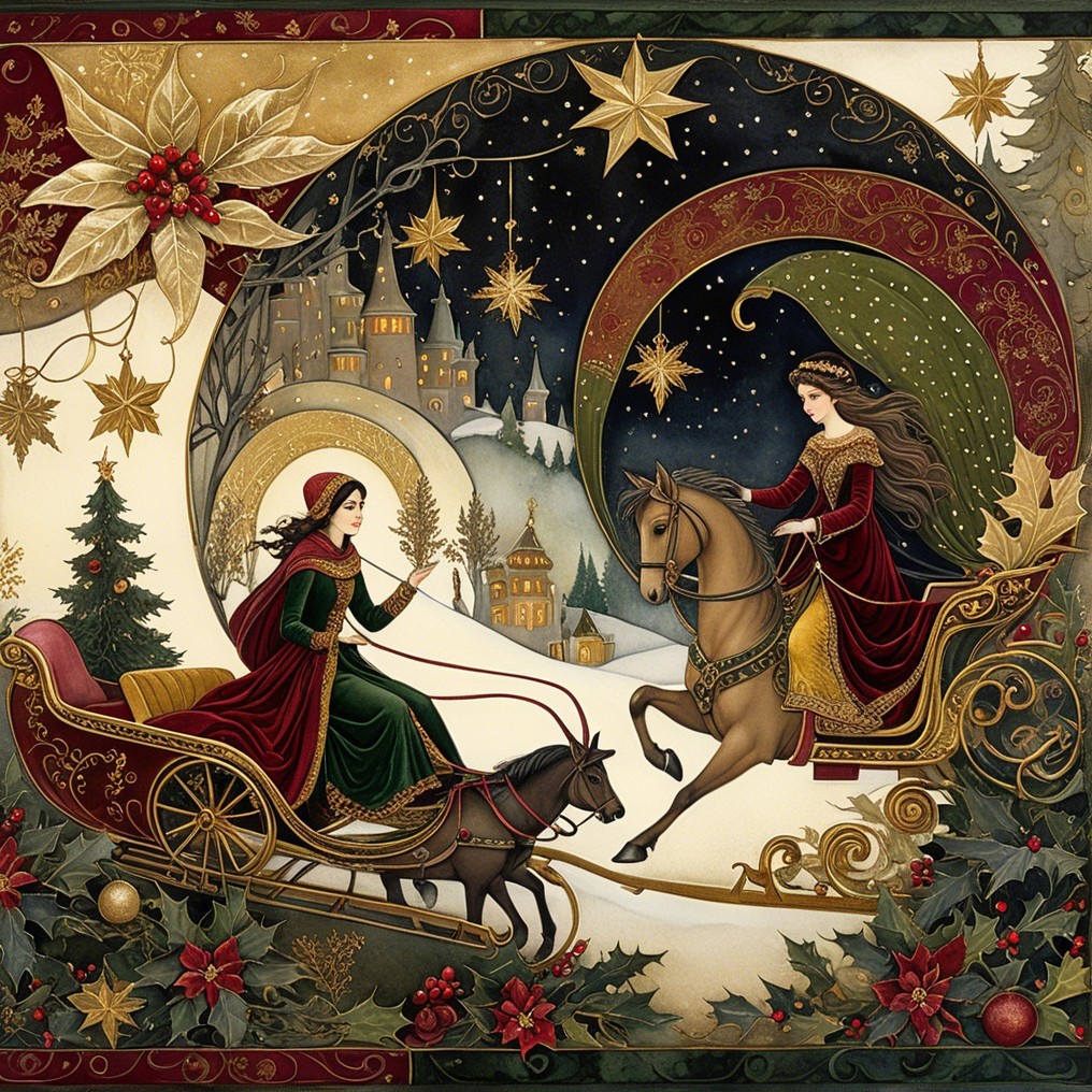 Legend of the Christmas girl and the magical Christmas, Beautiful young woman and girl in a magical Christmas sleigh riding through an enchanted winter wonderland, 3rd century Persian miniature art. Velvet Black, Shabby, Dull Gold, olive green, burgundy, Golden Ratio, Surreal Fantasy, Elegant, High Definition Ultra Fine 3D Line, Zenangle Style, Watercolor Patchwork , Arthur Rackham Style, Paul Kidby, Gediminas Prankevicius, Jacek Jerka, Extremely Detailed, Intricate, Thoughtful, HDR, Fractal, Beautiful, Award Winning, Fantasy Look, Fantasy, Crisp Quality