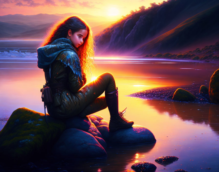 Prompt: "masterpiece, best quality, movie still, 2 giris, refgees girl, sit on rock, close-up, bright, happy, wet, muddy, dusty, warm soft lighting, sunset, (sparks:0.7), in mountain, dark fantasy"
