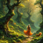 A serene fantasy scene features a woman in an orange dress walking through a lush, sunlit forest. Moss-covered trees and gentle streams surround her, while butterflies and a squirrel add charm.
