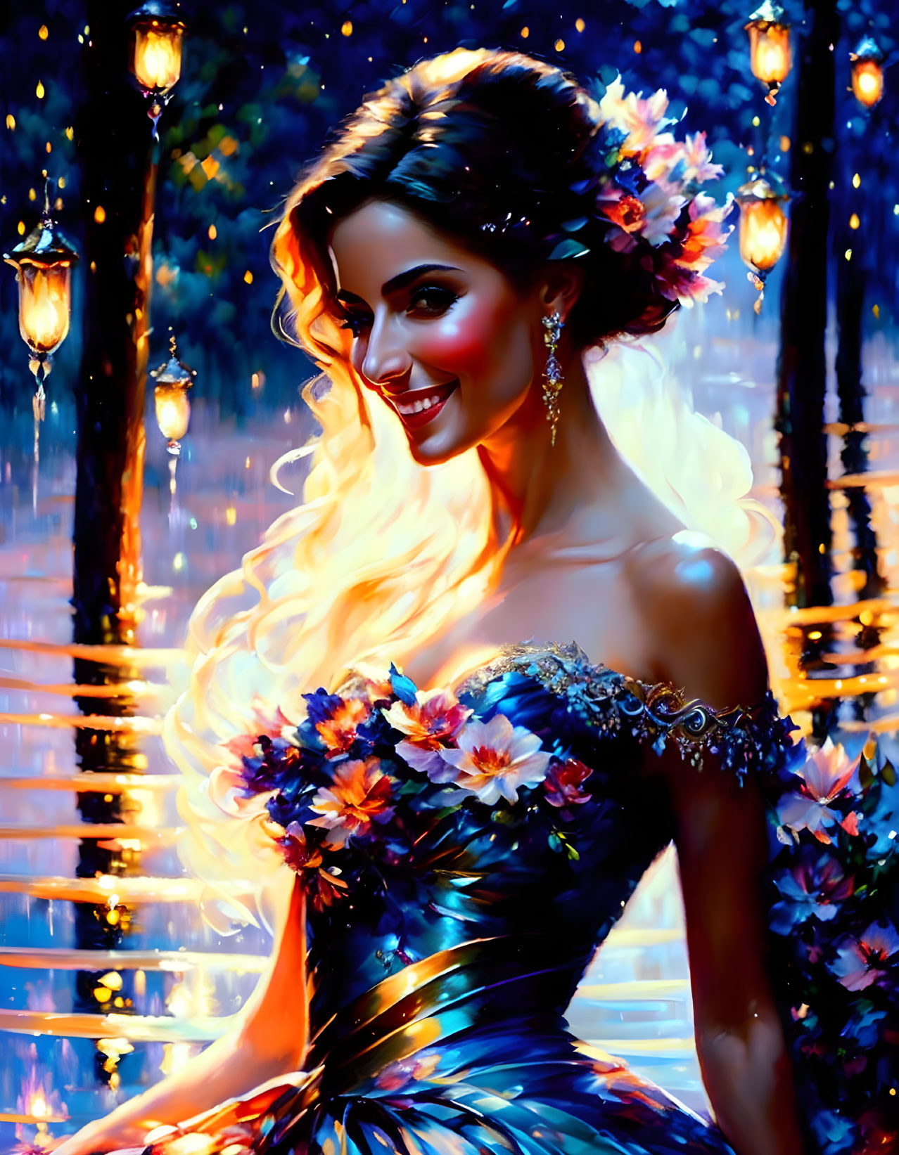 Prompt: "More you fuck around more you find out in style of Andrew Atroshenko, Karol Bak; stunning smile, reflections, fibonacci measured face details, fairy night dress, fireflies, swirling water, splashing water, watercolor painting."