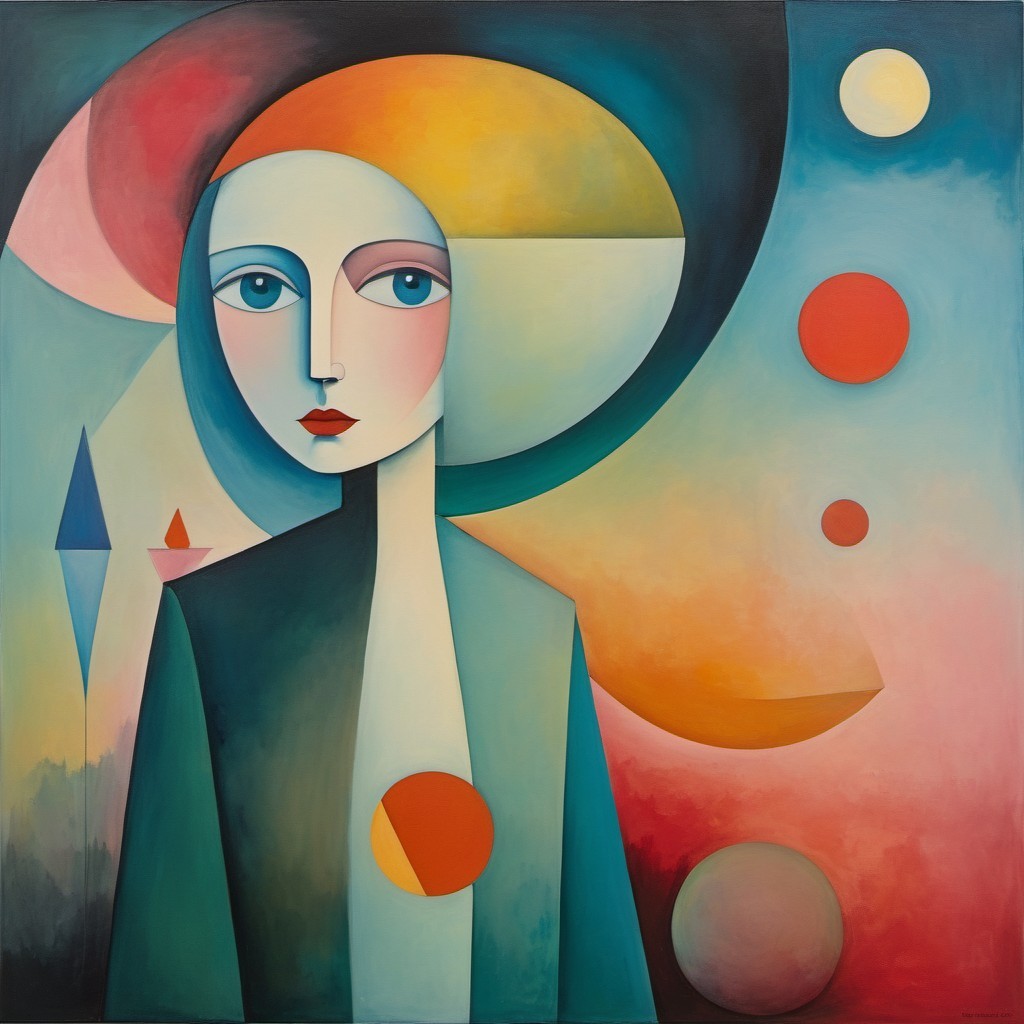 Abstract, colorful painting of a stylized human figure with geometric shapes and contrasting colors.