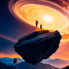 two friends atop a floating boulder over a rocky terrain; one leaps upward in celebration, looking across a vast valley in shades of blue and gold dominated by an awesome sky with a huge spiral galaxy and stars and nebula in sharp detail