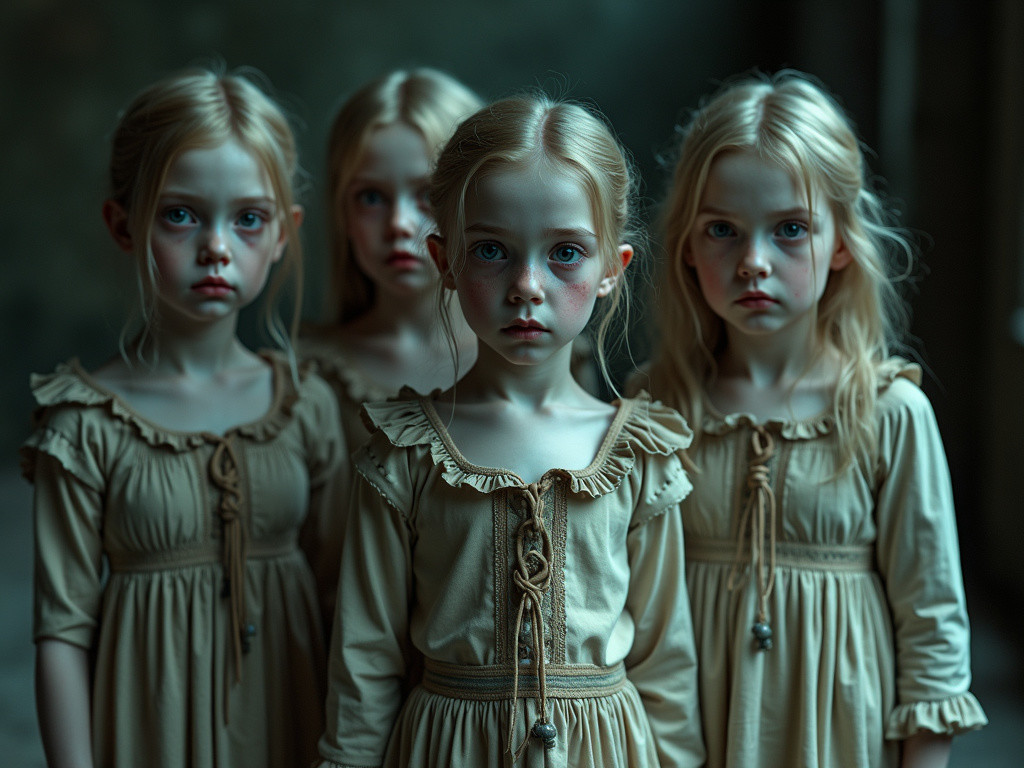 A haunting scene of four ethereal girls with pale skin and light hair, wearing tattered dresses, each displaying an eerie expression and streaks of red across their faces.