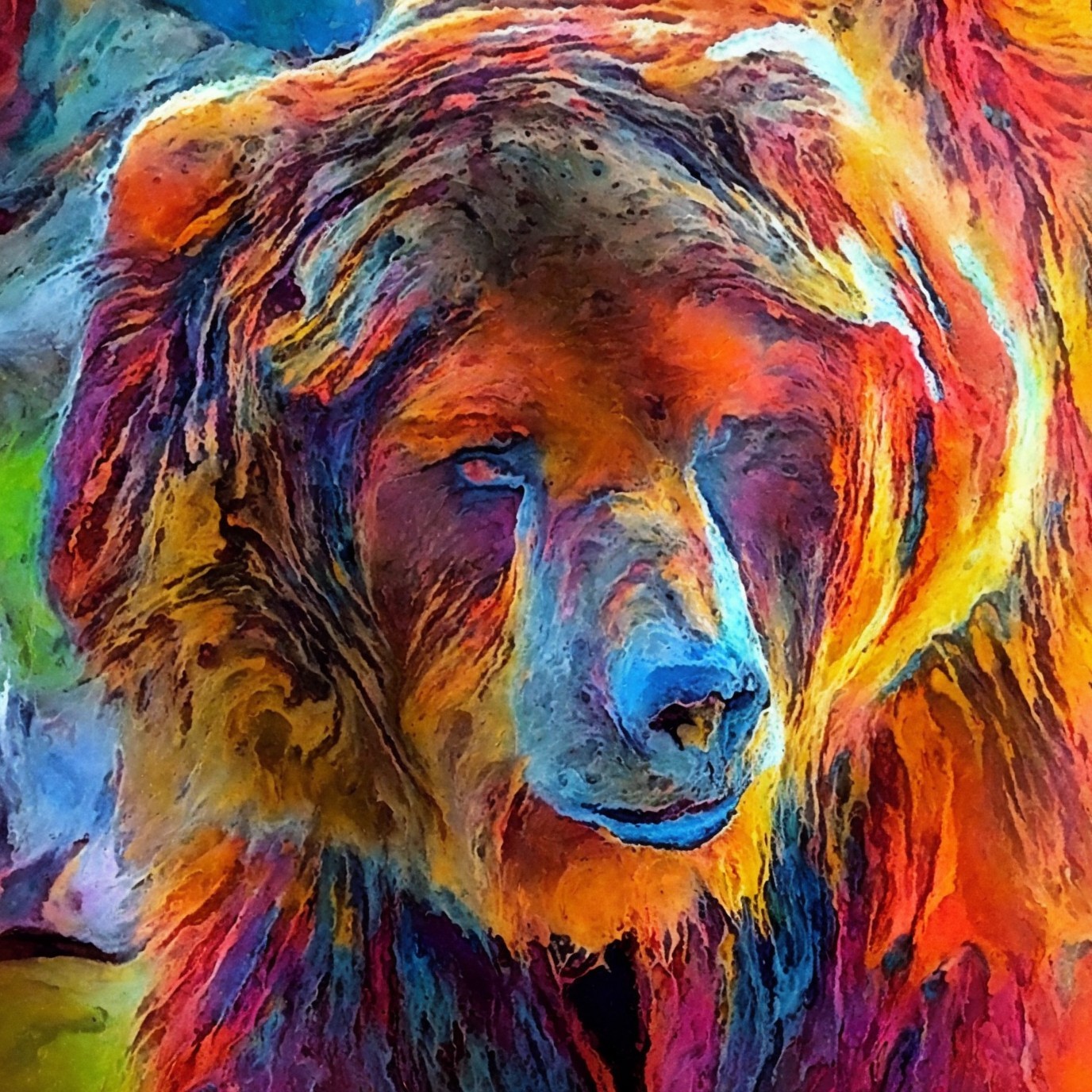 Colorful, abstract painting of a bear with vibrant hues of blue, orange, and yellow dominating the artwork.