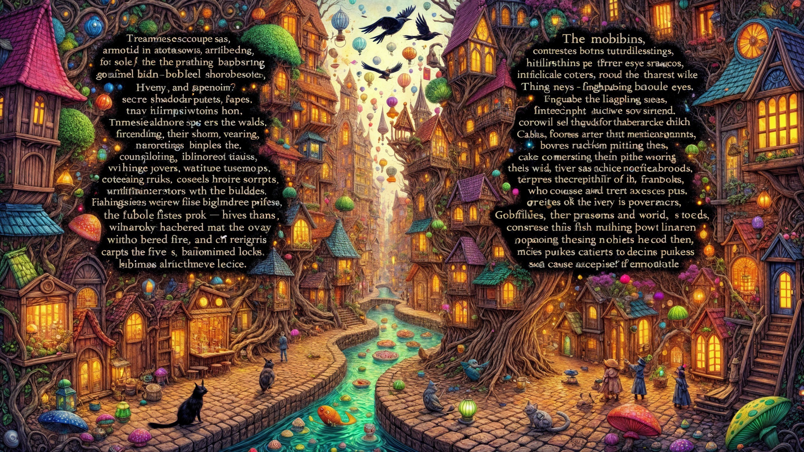 A magical city teems with life and whimsy, where cobblestone streets lead to secret courtyards. Floating markets, singing fish, and enchanted libraries create a vibrant, immersive experience.
