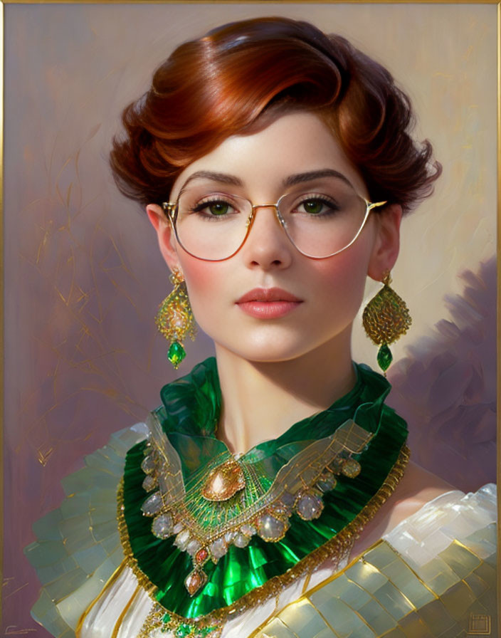 upper body portrait of dignified young woman with short auburn hair in pixie haircut wearing tinted wireframe glasses and emerald pendant with nehru collar