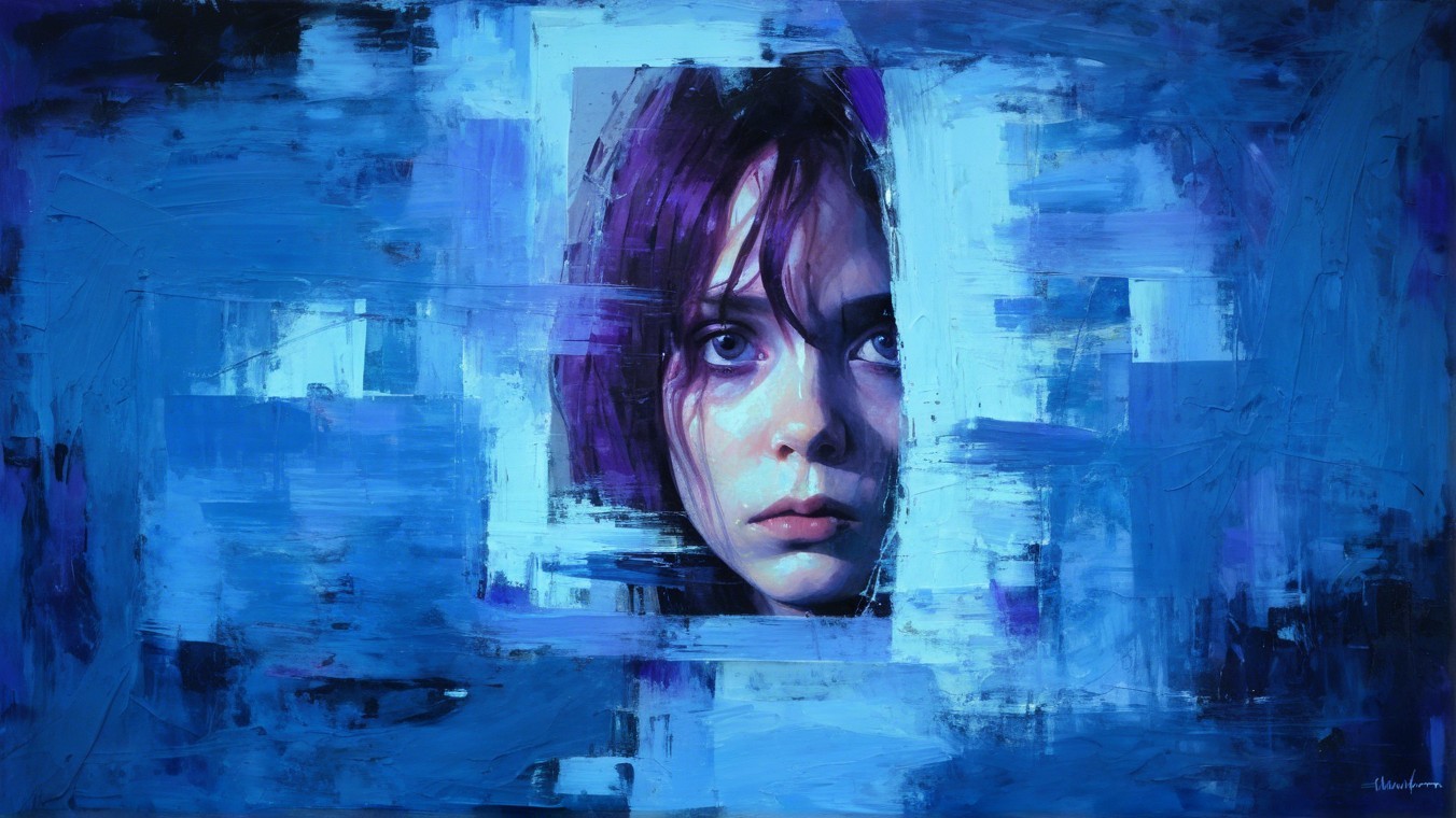 Prompt: portrait, girl, purple eyes, impasto oil painting, dark, abstract, ominous, style of Dave McKean, Jeremy Mann, Christopher Bucklow and Stephen Gammell