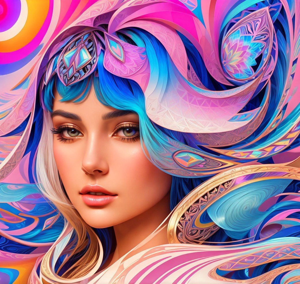 + Prompt:minimalistic graphic poster of a beautiful female face. Muted colors , tints of geometrical drawing. Op art and comic bookart, detailed ornamental features, illustrative stylization, graphic bioluminescent strokes, high fractalized textures, intricate line patterns.
