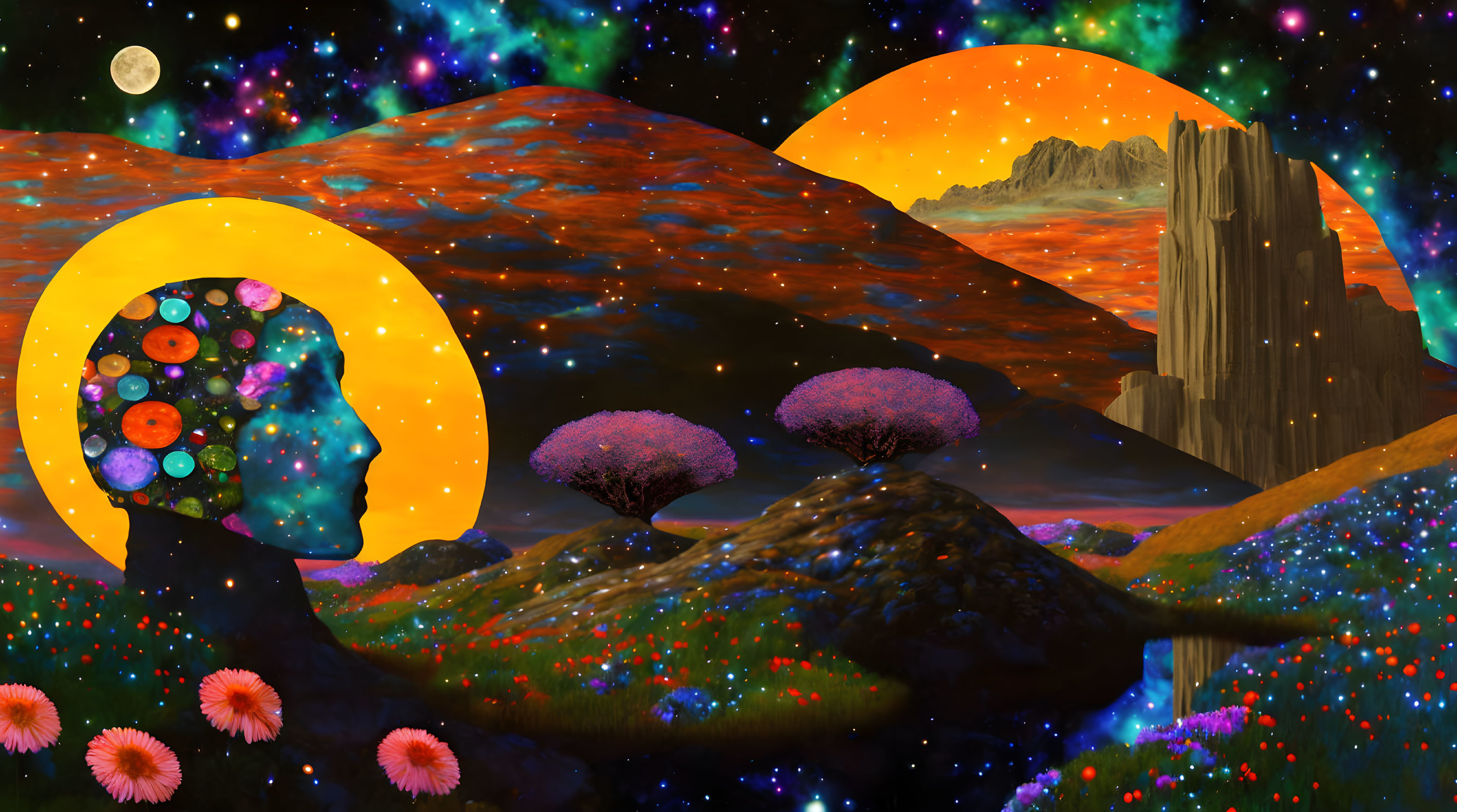 Colorful cosmic Nightsky over desolate oasis, A spinx head monument. Gem rock architecture ,k. Path through dreams. Faces in marble. Forest and flower details. By Gustav Klimt and Goya. Stone path. dreamscape. Mixed media. Fine art.