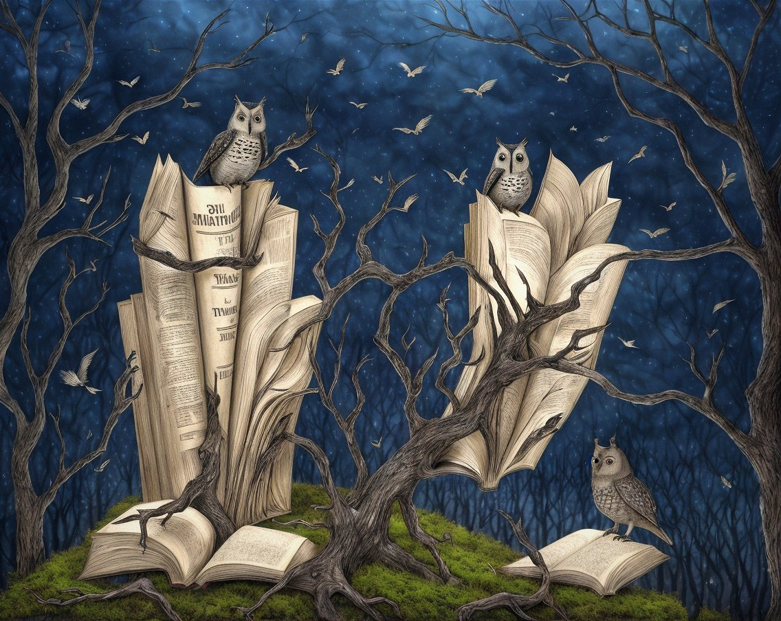 3D, Children’s book pencil sketch illustration by Sam Toft, two intellectual owls with glasses standing on open books and fluttering papers, many crows flying behind, moss and twigs underneath, intricate feather details, mystical aura, antique open books, dark and twisted branches with leaves, enchanting night sky, stars, clouds, ethereal glow, magical ambience, 3D rendering, pen and ink aesthetic, intricate line work, dramatic lighting, cinematic lighting, 3D shading, half relief with depth effect, shading for depth, mysterious and romantic setting