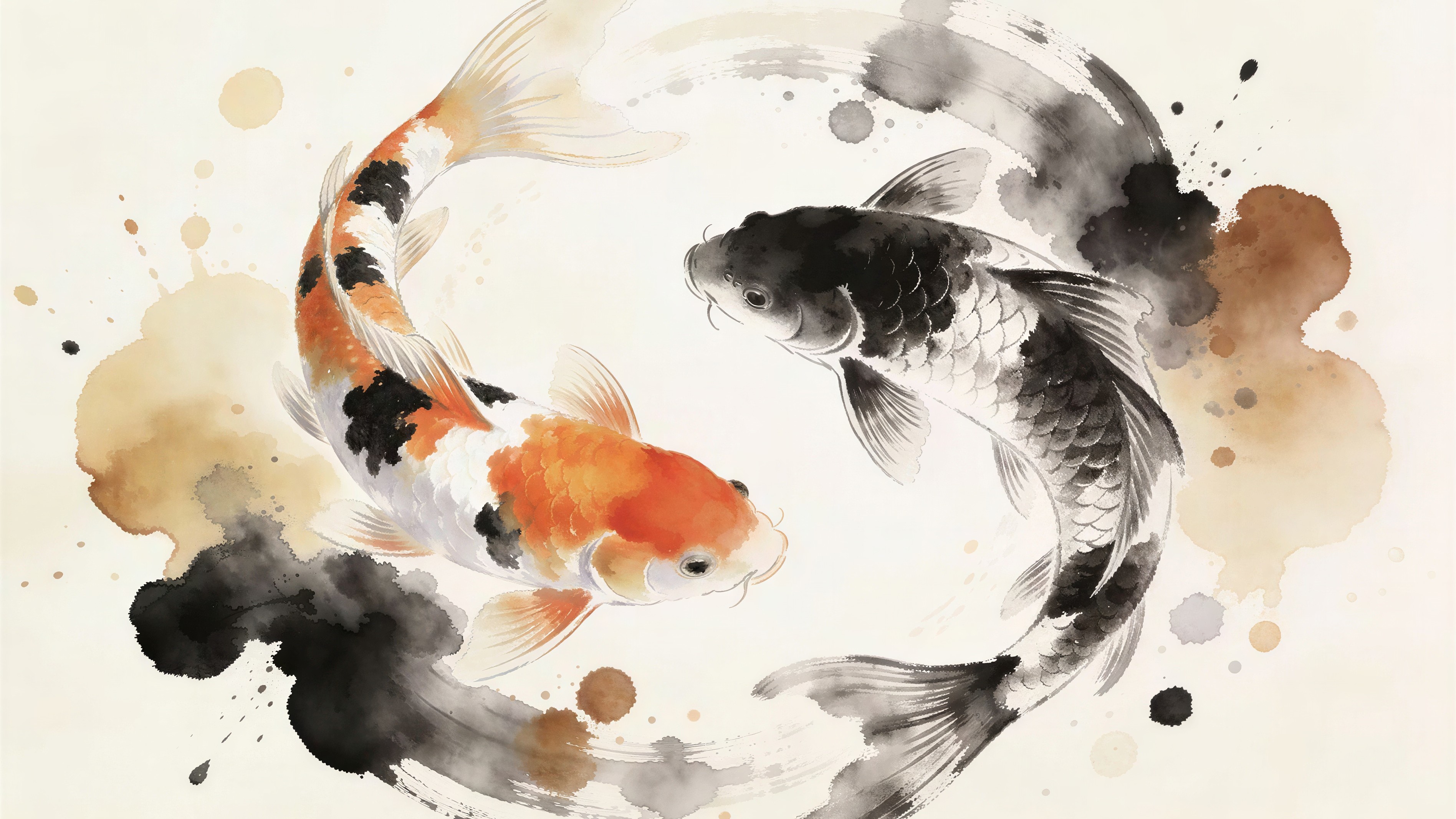 Two koi fish, one orange and white and one black and white, swim in a circular yin and yang formation, surrounded by a splash of watercolor paint in a subtle shade on top of a subtle gold background, with a vibrant and rich watercolor painting.
