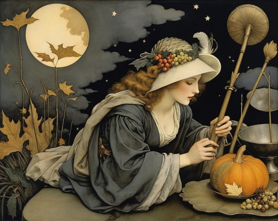 A serene woman adorned with autumn leaves carefully arranges pumpkins by moonlight, surrounded by a harvest-themed display, evoking the essence of fall and harvest festivities.