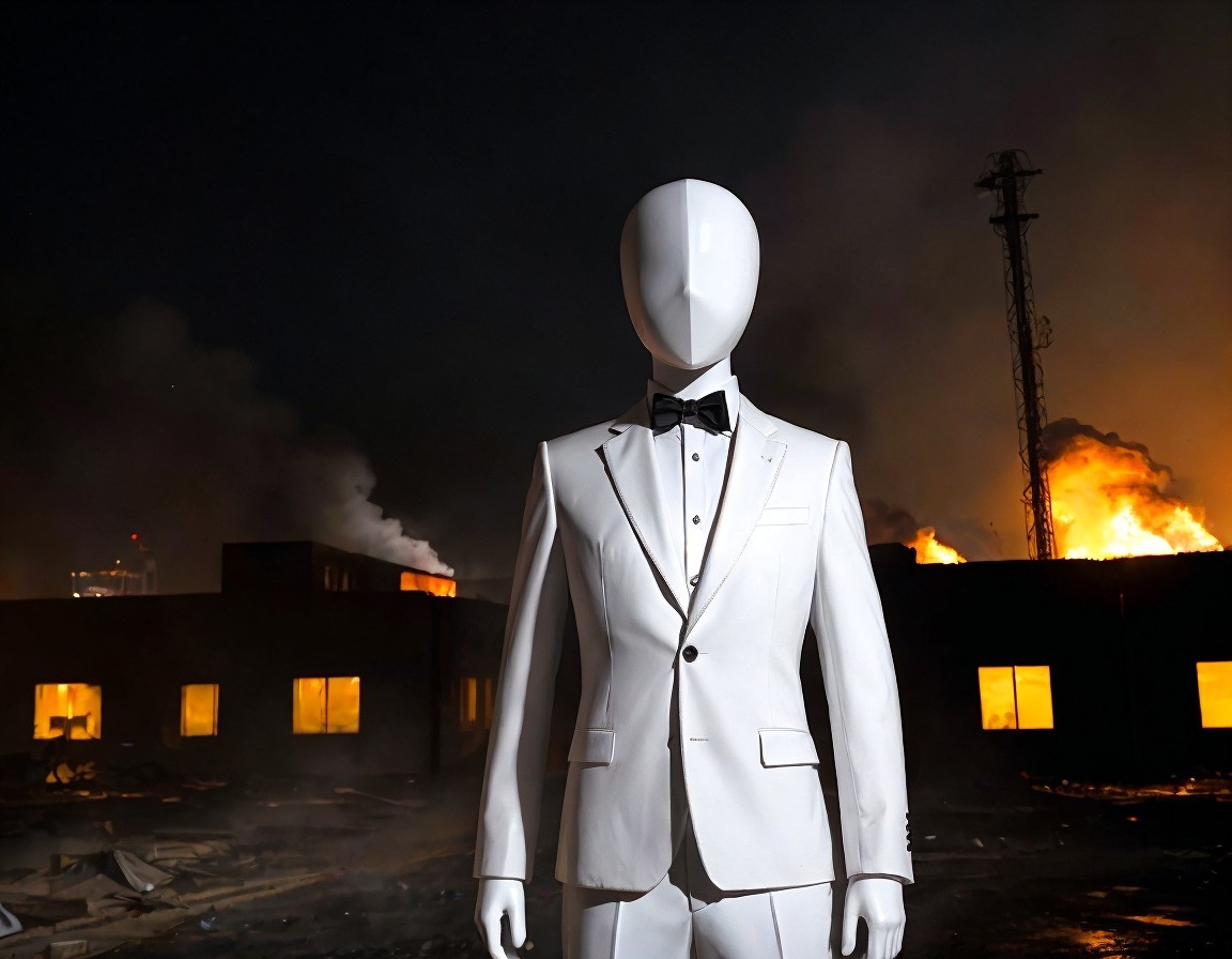 Prompt: "White mannequin in a black suit engulfed in flames in the center of the factory's backyard, factory chimneys are seen in the distance, evening time, no people, creepy, sinister atmosphere, perfect composition"