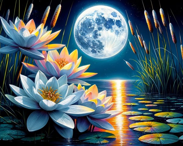 A serene night scene unfolds with a bright full moon illuminating a tranquil water surface. Striking white lilies with soft yellow and orange accents arch gracefully, surrounded by slender green reeds and dry grass. The deep blue-black background enhances the moon's glow and the lilies' colors, creating a peaceful, ethereal atmosphere with intricate details and vibrant hues.