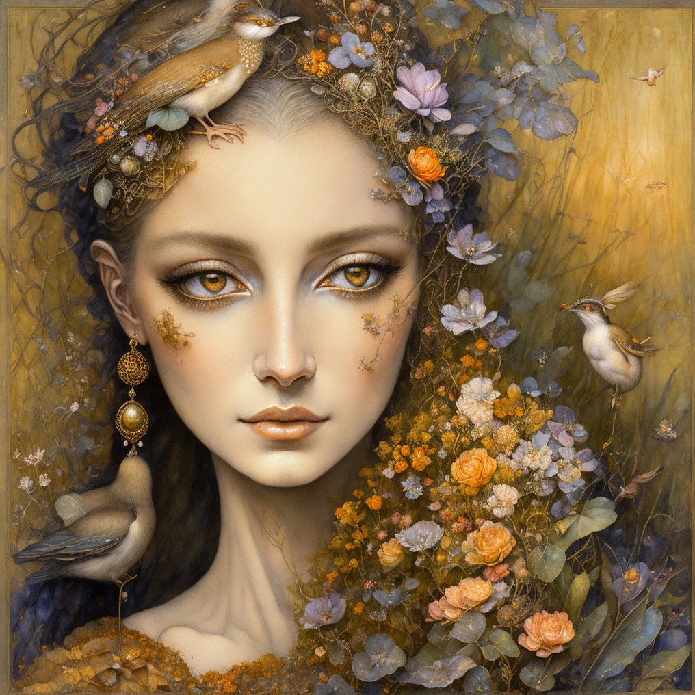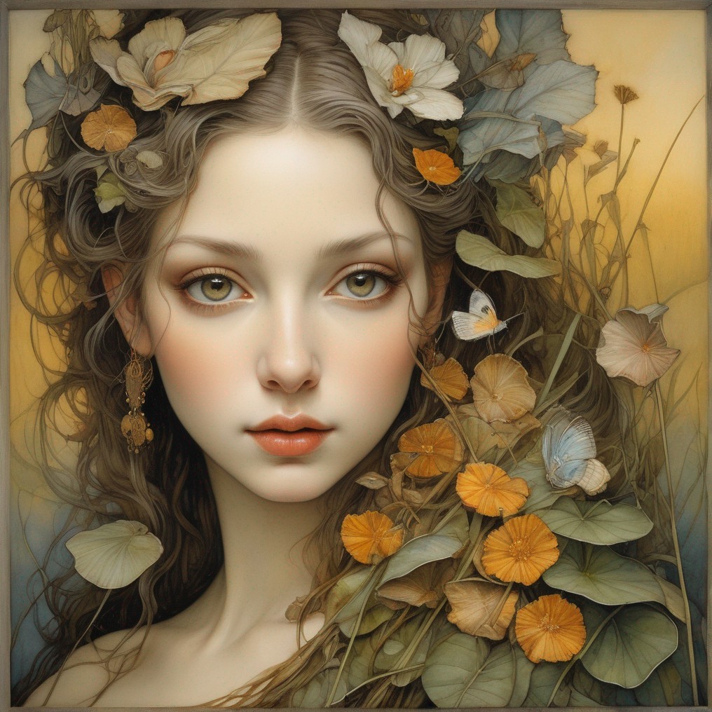 A painting of a woman with large, expressive eyes, adorned with leaves and white flowers in her flowing hair.